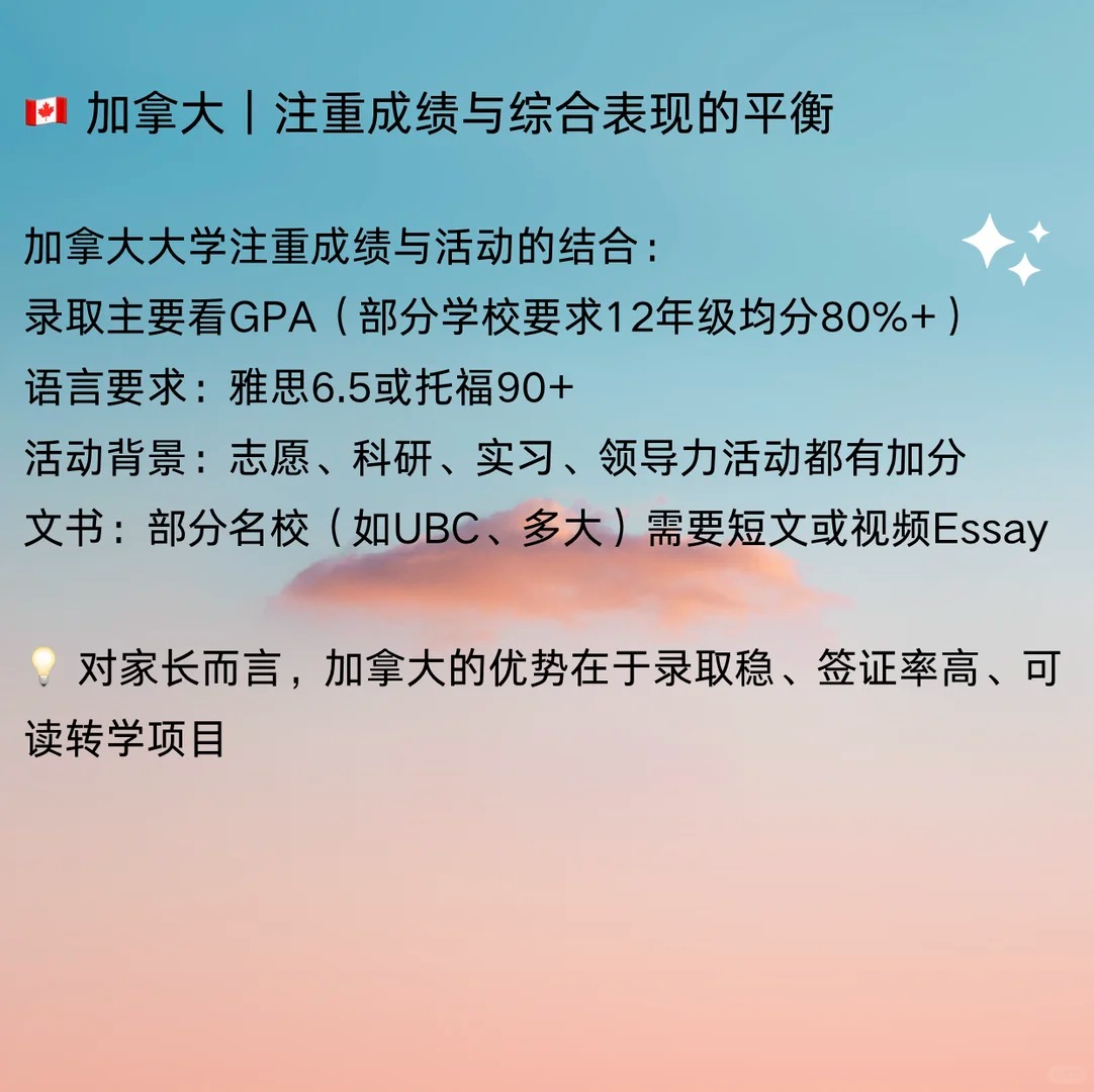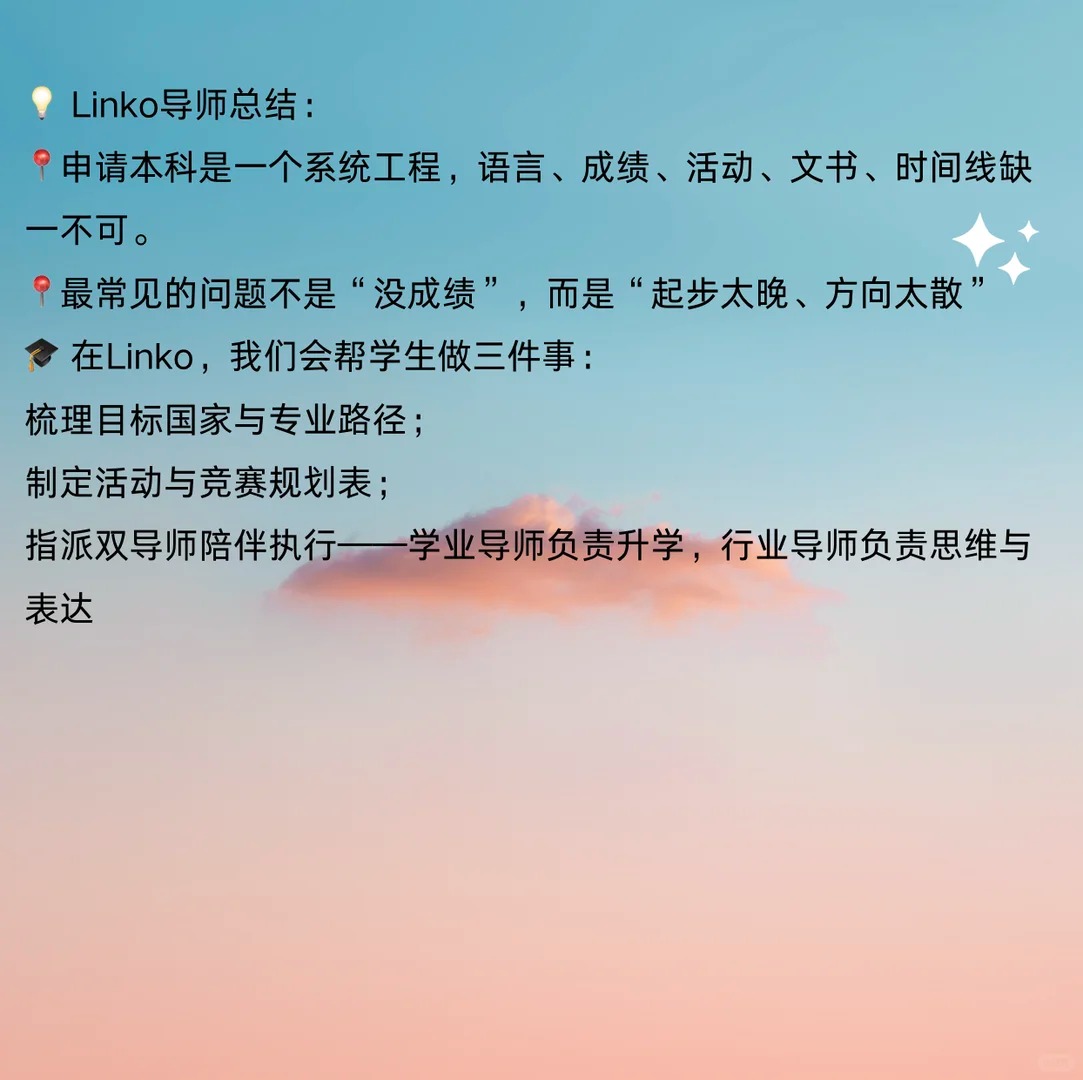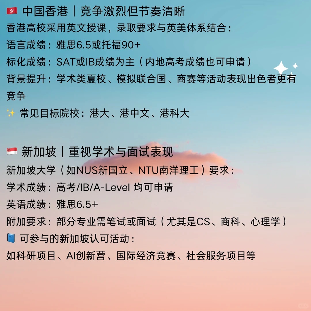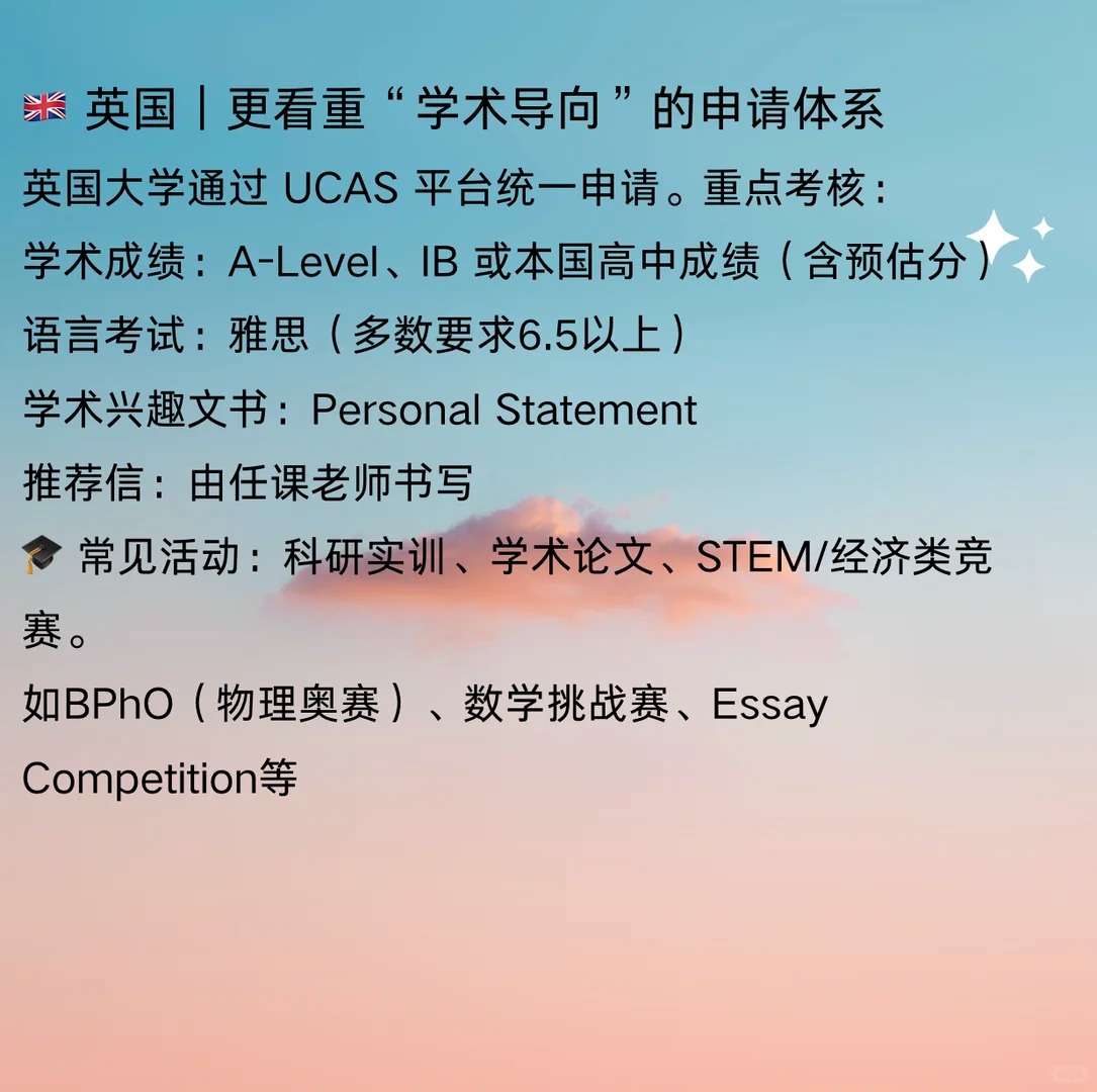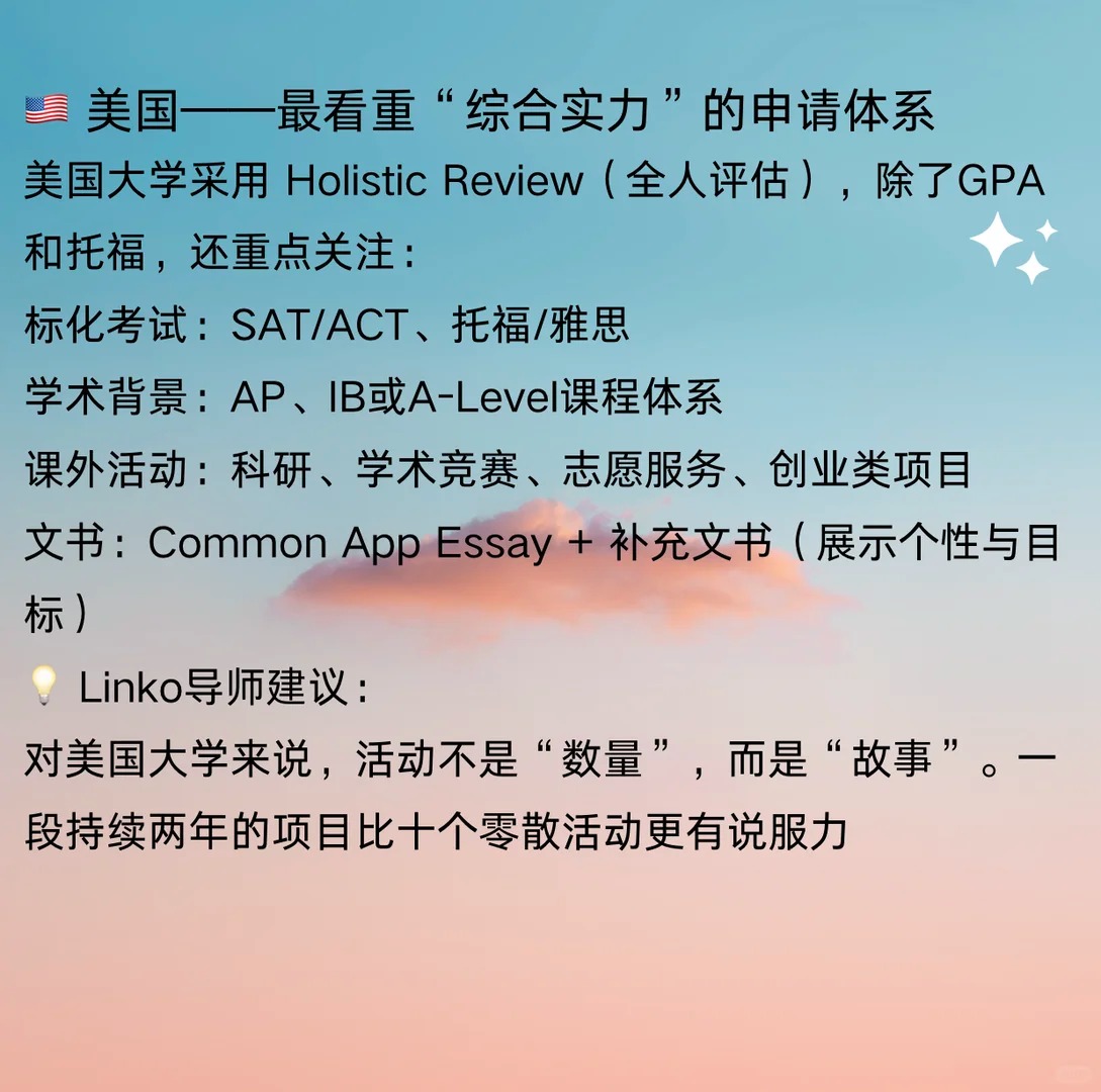 ?‍? 很多家长问我们: “孩子成绩不错,但到底要准备哪些活动和材料,才能申请海外本科?” “别人家孩子怎么都有一堆比赛和科研项目,我们该从哪里开始?” 其实,不同国家的本科申请体系差异很大,但有一个共同点: 不仅看分数,更看孩子的成长轨迹和潜力 今天,Linko就带你快速了解—— 申请美国、英国、加拿大、中国香港、新加坡本科分别要准备什么 美国|最看重“综合实力”的申请体系 美国大学采用全人评估,除了GPA和托福,还重点关注 标化考试:SAT/ACT、托福/雅思 学术背景:AP、IB、A-Level课程体系 课外活动:科研、学术竞赛、志愿服务 文书:Common App Essay + 补充文书 英国|更看重“学术导向”的申请体系 英国大学通过 UCAS 平台统一申请 学术成绩:A-Level、IB 或高中成绩 语言考试:雅思 学术兴趣文书 推荐信 常见活动:科研实训、学术论文、STEM/经济类竞赛 加拿大|注重成绩与综合表现的平衡 加拿大大学注重成绩与活动的结合: 录取主要看GPA 语言要求:雅思6.5或托福90+ 活动背景:志愿、科研、实习、领导力活动都有加分 文书:部分名校(如UBC、多大)需要短文或视频Essay 加拿大的优势在于录取稳、签证率高、可读转学项目 中国香港|竞争激烈但节奏清晰 香港高校采用英文授课,录取要求与英美体系结合 语言成绩:雅思6.5或托福90+ 标化成绩:SAT或IB成绩为主 背景提升:学术类夏校、模联、商赛等活动表现出色者更有竞争力 新加坡|重视学术与面试表现 学术成绩:高考/IB/A-Level 均可申请 英语成绩:雅思6.5+ 附加要求:部分专业需笔试或面试 可参与的新加坡认可活动: 如科研项目、AI创新营、国际经济竞赛、社会服务项目等 ? Linko导师总结 申请本科是一个系统工程,语言、成绩、活动、文书、时间线缺一不可 最常见的问题不是“没成绩”,而是“起步太晚、方向太散” ? 在Linko,我们会帮学生做三件事 1⃣梳理目标国家与专业路径 2⃣制定活动与竞赛规划表 3⃣指派双导师陪伴执行——学业导师负责升学,行业导师负责思维与表达