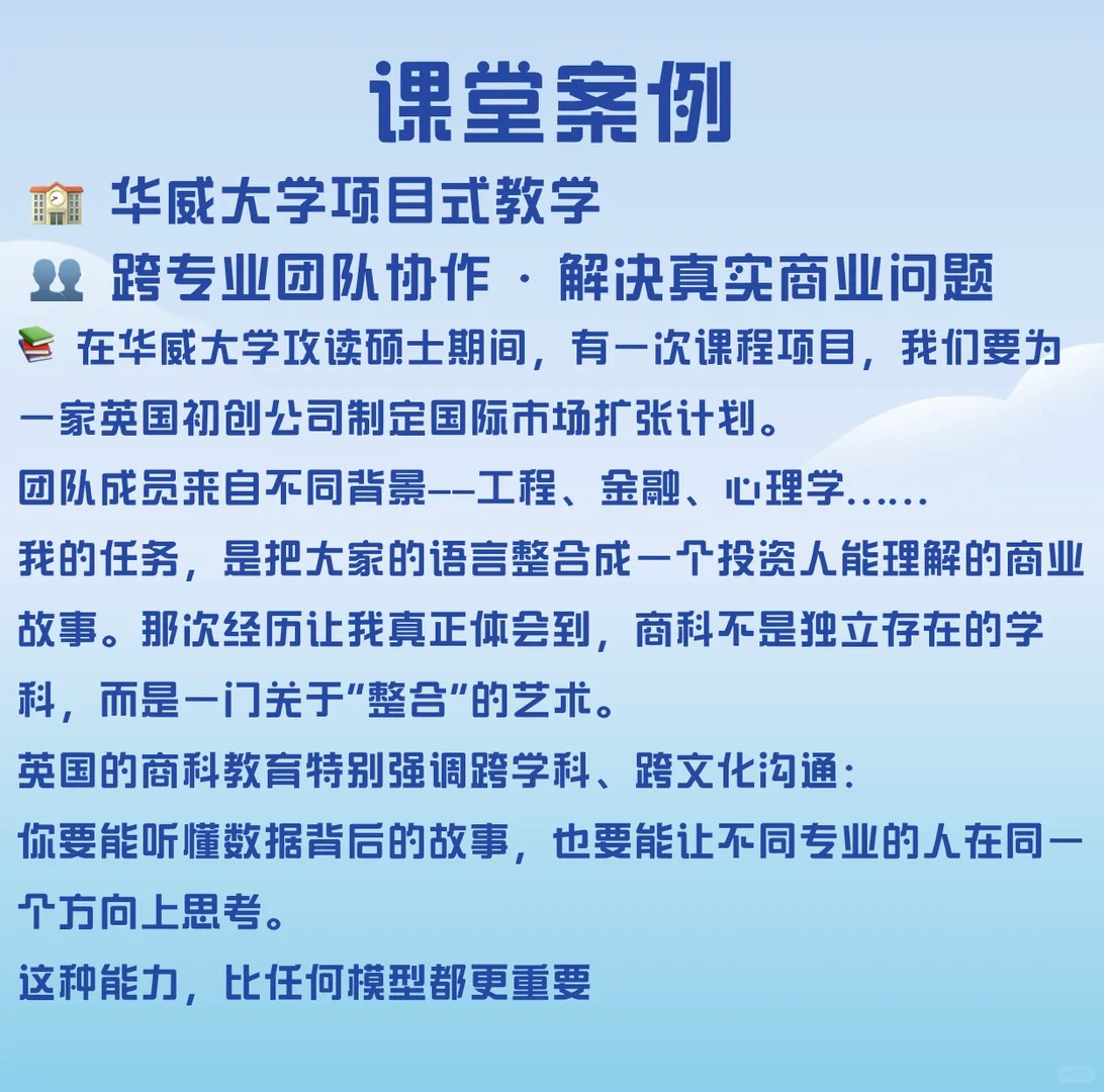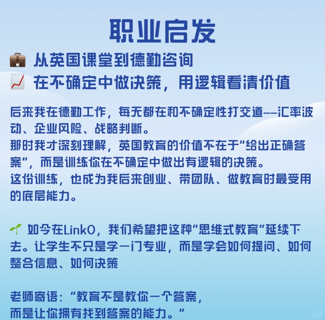 “在英国读商科,我学到的不是管理,而是‘看世界的方式’” ??‍? 我是RAY,LinkO联合创始人兼CEO 本科就读于英国利物浦大学会计与金融专业,硕士毕业于英国华威大学管理学院(Warwick Business School) 在回国创办LinkO之前,我曾在德勤财务咨询部门工作多年,参与世界500强企业的估值与投融资项目 很多学生问我:老师,英国商科到底和美国的有什么不一样? 其实在英国读书的几年,让我学到的远不止课堂知识——它彻底改变了我看待商业、看待世界的方式 ? 我在英国的第一站,是利物浦大学 那时候的我,对“商科”理解还很浅,只觉得那是关于数字、报表、市场的学科 直到有一次课上,教授问了我们一个问题: “如果利润是企业存在的理由,那信任是什么?” 全班安静了几秒,我那时才第一次意识到: 英国的商科教育并不急着告诉你“答案”,而是让你去质疑问题本身 从那时起,我开始学会用商业思维去理解社会,用人文视角去看待商业 课堂上我们研究星巴克的品牌文化、分析苹果的创新战略; 老师总强调:“商业行为背后永远是人。” 我渐渐发现,商科的本质不是记公式、算模型,而是理解人、理解选择、理解价值的逻辑 ? 在华威大学攻读硕士期间,我的收获更深 那是一所非常重视思辨和实践的学校 有一次课程项目,我们要为一家英国初创公司制定国际市场扩张计划 团队成员来自不同背景——工程、金融、心理学…… 我的任务,是把大家的语言整合成一个投资人能理解的商业故事 那次经历让我真正体会到,商科不是独立存在的学科,而是一门关于“整合”的艺术 英国的商科教育特别强调跨学科、跨文化沟通: 你要能听懂数据背后的故事,也要能让不同专业的人在同一个方向上思考 这种能力,比任何模型都更重要 ? 后来我在德勤工作,每天都在和不确定性打交道——汇率波动、企业风险、战略判断 那时我才深刻理解,英国教育的价值不在于“给出正确答案”,而是训练你在不确定中做出有逻辑的决策 这份训练,也成为我后来创业、带团队、做教育时最受用的底层能力 ? 如今在LinkO,我们希望把这种“思维式教育”延续下去 让学生不只是学一门专业,而是学会如何提问、如何整合信息、如何决策 英国商科给我的最大启发是—— 教育不是灌输,而是唤醒 它让你在复杂的世界里,始终有能力看清方向