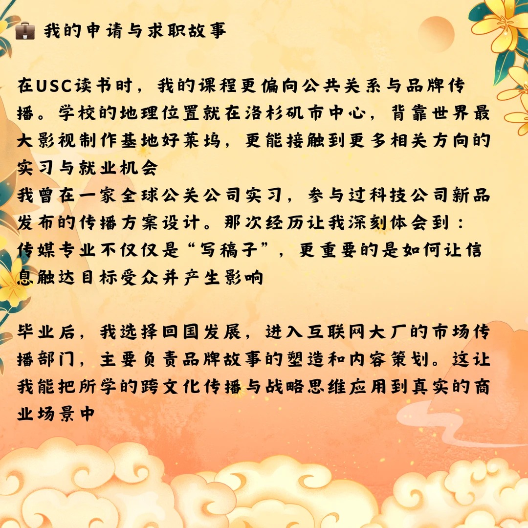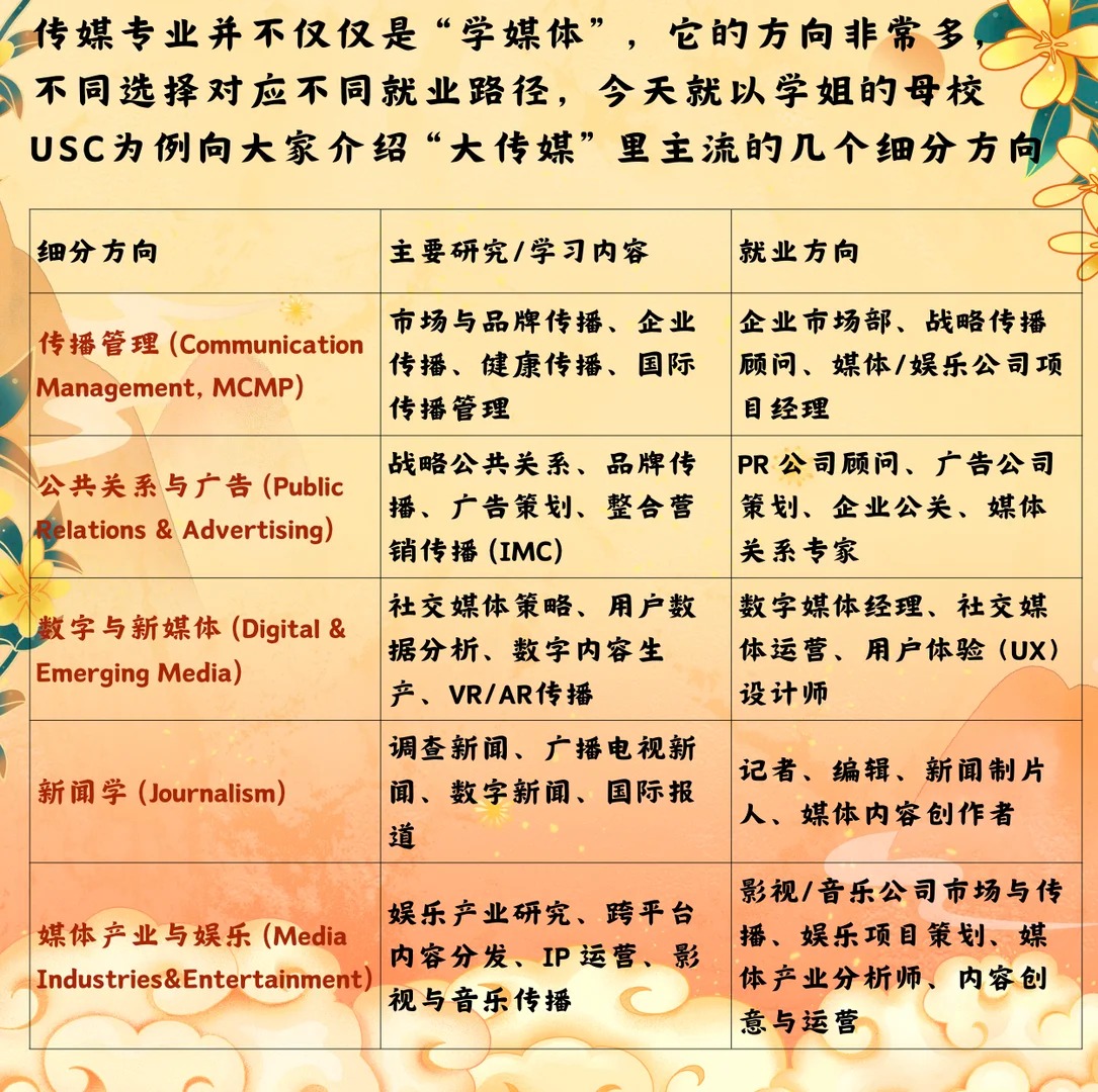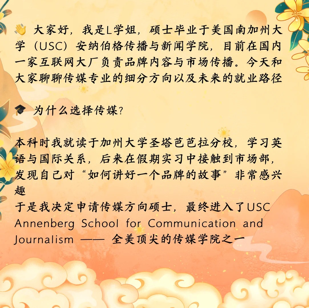 ? 大家好,我是L学姐,毕业于美国南加州大学(USC)安纳伯格传播与新闻学院,目前在国内一家互联网大厂负责品牌内容与市场传播,今天和大家聊聊传媒专业的细分方向以及未来就业路径 ? 为什么选择传媒 本科时我读的是英语与国际关系,后来在实习中接触到市场部,发现自己对“如何讲好一个品牌的故事”非常感兴趣 于是决定申请传媒类硕士,最终进入了USC——全美顶尖的传媒学院之一 ? 传媒专业的细分方向非常多,不同选择对应不同就业路径 1⃣ 新闻与传播(Journalism & Communication) 典型学校:Columbia, Northwestern 方向:新闻报道、媒体评论、公共事务 就业:媒体记者、编辑、智库 2⃣ 公共关系与广告(PR & Advertising) 典型学校:USC, BU 方向:品牌传播、公关、数字营销 就业:公关、广告公司、大厂市场部 3⃣ 影视与新媒体(Film & Digital Media) 典型学校:USC, NYU, UCLA 方向:影视制作、内容策划、短视频与流媒体 就业:影视公司、流媒体平台(Netflix、爱奇艺) 4⃣ 媒体管理与战略(Media Management) 典型学校:Northwestern, UT Austin 方向:传媒产业运营、跨国媒体战略 就业:传媒集团、互联网平台战略咨询 ? 我的申请与求职故事 在USC读书时,我的课程更偏公共关系与品牌传播 毕业后曾在一家全球公关公司实习,参与过科技公司新品发布的传播方案设计。那次经历让我深刻体会到传媒专业不仅仅是写稿子,更重要的是如何让信息触达目标受众并产生影响 毕业后,我选择回国发展,进入互联网大厂的市场传播部门,主要负责品牌故事的塑造和内容策划。这让我能把所学的跨文化传播与战略思维应用到真实的商业场景中 ? 给学弟学妹们的建议 确定细分方向:传媒跨度很大,新闻、PR、新媒体等都不一样,要根据兴趣和职业规划来选 实习是关键:传媒看重实战,多去广告、公关、媒体公司实习积累经验 提升综合能力:除了写作与策划,数据分析、数字营销工具、跨文化沟通都是加分项 ✨ 总结 传媒留学不只是学“传播”,而是找到你在信息时代的立足点。无论未来想进媒体、广告,还是科技公司市场部,传媒专业都能帮你打开一扇大门