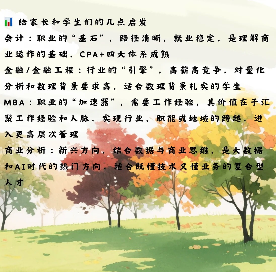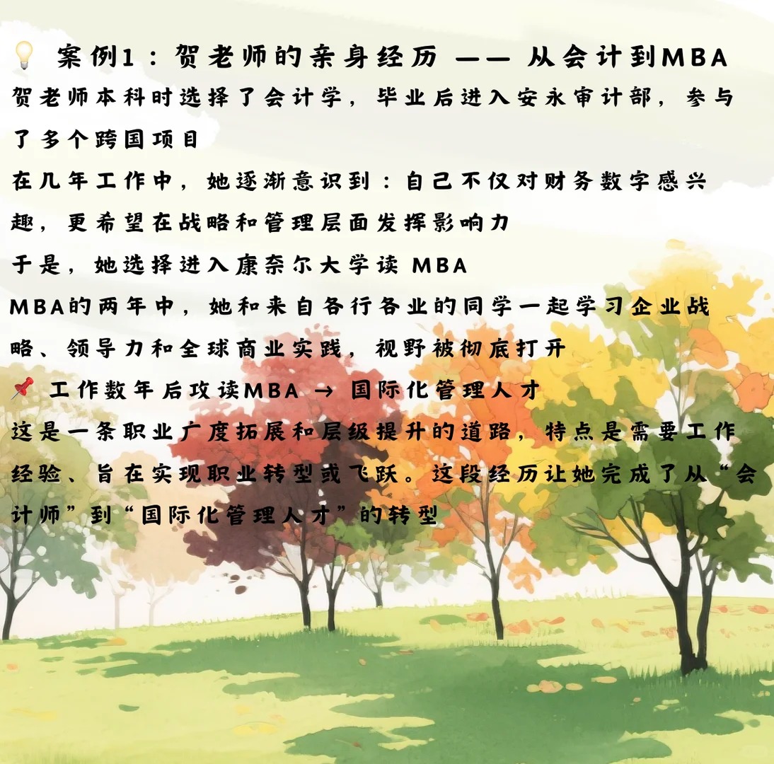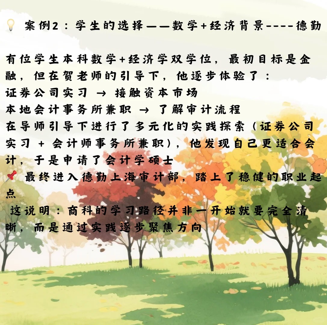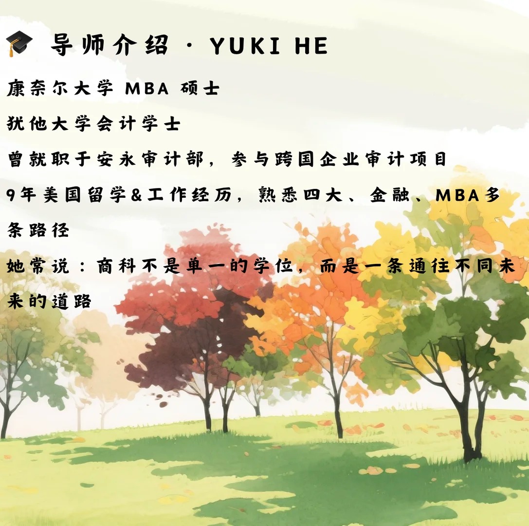??? 当孩子说“想学商科”的时候,很多家长第一反应是:金融?会计?MBA? 可在美国,商科专业其实有很多不同的方向,不同选择会带来完全不同的就业道路 今天,我们就通过两个真实的故事,聊聊商科留学背后的路径与可能 ? 导师介绍 · Yuki He 康奈尔大学 MBA 硕士 犹他大学会计学士 曾就职于安永审计部,参与跨国企业审计项目 9年美国留学&工作经历,熟悉四大、金融、MBA多条路径 她常说:“商科不是单一的学位,而是一条通往不同未来的道路。” ? 案例1:学生的选择 —— 数学+经济背景到德勤 有位学生本科是 数学+经济学双学位,最初目标是金融,但在贺老师的引导下,他逐步体验了: 证券公司实习 → 接触资本市场 本地会计事务所兼职 → 了解审计流程 经过多次尝试,他发现自己更适合会计,于是申请了会计硕士 ? 最终进入德勤上海审计部,踏上了稳健的职业起点 ? 这说明:商科的学习路径并非一开始就要完全清晰,而是通过实践逐步聚焦方向 ? 案例2:贺老师的亲身经历 —— 从会计到MBA 贺老师本科时选择了 会计学,毕业后进入安永审计部,参与了多个跨国项目 在几年工作中,她逐渐意识到:自己不仅对财务数字感兴趣,更希望在战略和管理层面发挥影响力 于是,她选择进入康奈尔大学读 MBA MBA的两年中,她和来自各行各业的同学一起学习企业战略、领导力和全球商业实践,视野被彻底打开 ? 这段经历让她完成了从“会计师”到“国际化管理人才”的转型 ? 给家长和学生的几点启发 会计硕士:路径清晰,就业稳定,CPA+四大体系成熟 金融/金融工程:高薪高竞争,适合数理背景扎实的学生 MBA:需要工作经验,帮助跳出原有领域,进入更高层次管理 商业分析:新兴方向,结合数据与商业思维,适应AI时代发展 ✨ 贺老师寄语 “无论是我的经历,还是学生的成长,都让我更加确信: ? 商科并不是单一的标签,而是帮助年轻人找到最适合自己职业舞台的钥匙。”