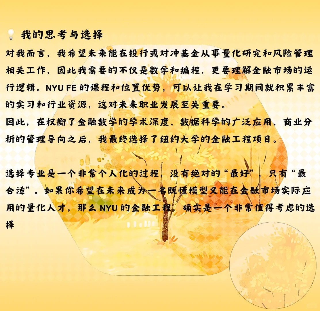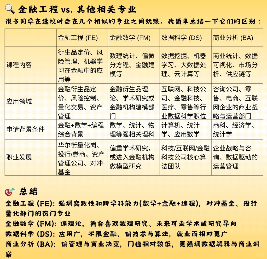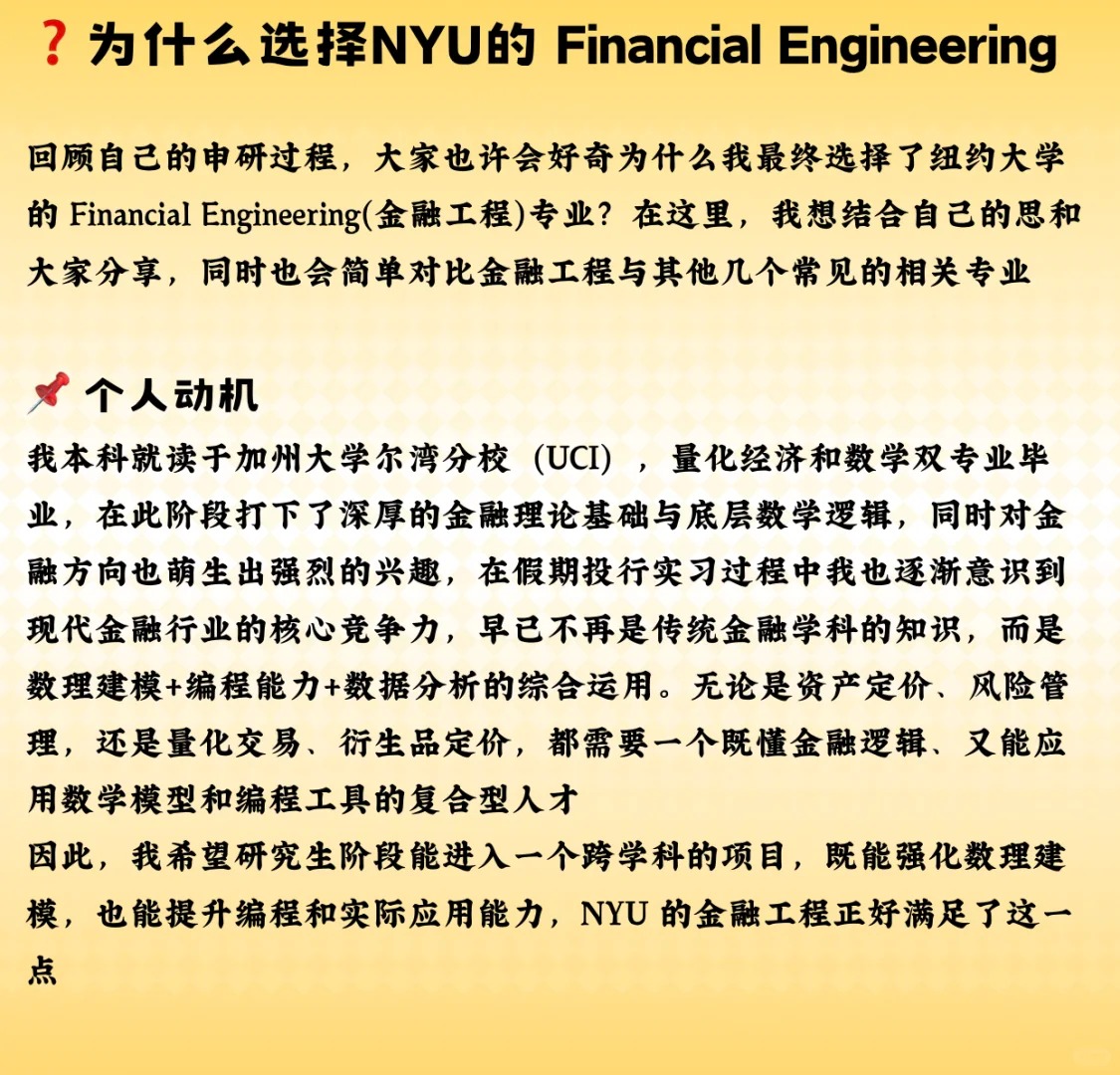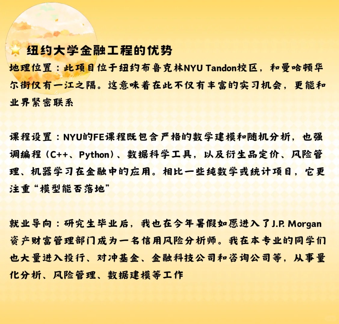 👋大家好,我是25届的S学长,目前就职于J.P. Morgan 担任credit risk analyst, 今天和大家聊聊我为什么在研究生阶段选择了纽约大学的金融工程专业。很多同学在申请的时候都会纠结:到底是选金融工程、金融数学,还是数据科学、商业分析?今天结合我的经历给大家做个分享 ❓为什么选择金融工程 我本科是学量化经济+数学的,在实习阶段发现,金融行业已经不是单靠金融理论就能吃得开。无论是风险管理、量化交易还是衍生品定价,核心竞争力都在于数学建模+编程能力+数据分析的结合。因此在研究生阶段我选择了既能继续打磨数理建模能力,又能锻炼编程和数据分析,同时又贴合金融市场实际的专业。NYU 的金融工程正好就是这样一个交叉学科 ✨NYU MFE的优势 地理位置好:项目在布鲁克林,离曼哈顿华尔街仅一地铁站,拥有大量进入投行和基金公司实习的机会 课程实用:既有数学和概率论的硬核内容,又非常强调编程(Python、C++)和机器学习在金融里的应用 就业导向:NYU MFE的毕业生在投行、对冲基金、金融科技公司都很受欢迎,校友圈也非常强大 方向灵活:项目有不同 track,比如计算金融、金融数据分析、风险管理等,可以根据兴趣选择 🔍和其他专业的对比 金融工程 (FE):数学+编程+金融应用,最贴近行业实际,适合进投行、做量化或风险管理 金融数学 (FinMath):偏理论和数学推导,如果数学功底很强,想读博或做模型研究,这个更合适 数据科学 (DS):更广泛,算法、机器学习都学,但金融只是应用之一。想在科技、互联网或跨行业发展,它很有优势 商业分析 (BA):数据驱动的商业洞察,编程和数学没那么深,偏向咨询、管理、战略类工作 总结一下,如果大家确定未来要扎根金融行业,尤其是想做 Quant 或风险管理,FE 是最合适的选择;如果想跳出金融行业,转去互联网或科技公司,那数据科学可能更合适;商业分析则更像管理方向的跳板 🌟给学弟学妹的建议 其实没有哪个专业是“最好”的,关键是和你未来的方向契不契合。多思考自己是想往金融业扎根,还是去科技公司,或是未来走咨询管理方向。确定目标,再看哪个项目能帮你实现,那就是最适合的