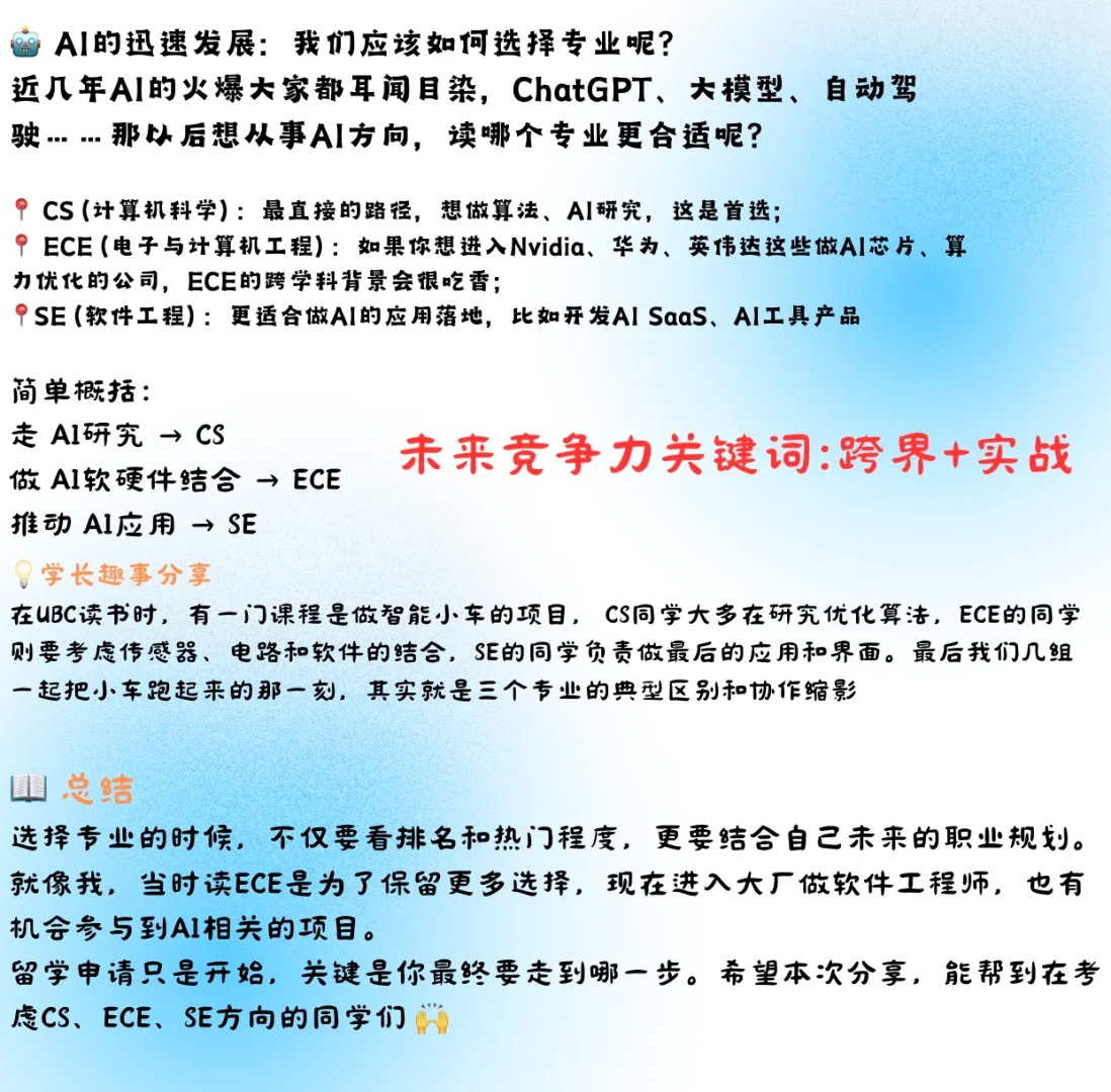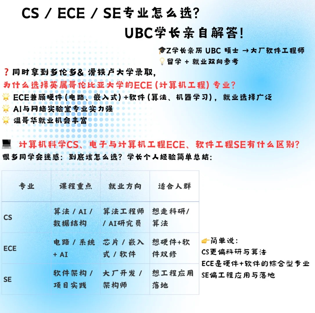 👋 大家好,我是Z同学,英属哥伦比亚大学电子与计算机工程(ECE)硕士毕业,目前在国内大厂做软件工程师。今天想与大家分享当初为什么选择ECE,其与CS、SE等热门专业有什么区别,以及对以后想做AI同学的一些建议 🎓 为什么选择UBC的ECE 当初申请时,我也同时收到了几所同等级学校的录取,比如多伦多大学(CS方向)和滑铁卢大学(SE方向)最后选择UBC,是因为其在北美就业市场认可度高,特别是在温哥华本地有很多大厂和创业公司,实习机会更多。而ECE的课程设置,既有硬件基础(电路、嵌入式),又有软件方向(算法、机器学习),可以让我在职业选择上更灵活 🖥 CS、ECE、SE 有什么区别 CS(计算机科学)课程重点:算法、人工智能、数据结构;就业方向:算法工程师、AI研究员、数据科学家 ;适合想做科研、AI算法 ECE(电子与计算机工程)课程重点:系统+AI基础;就业方向:芯片设计、嵌入式、软件工程; 适合想硬件+软件双向发展 SE(软件工程)课程重点:软件架构、项目实践; 就业方向:大厂开发、架构师、IT咨询; 适合想进大厂做应用层开发 简单说: CS更偏科研与算法 ECE是硬件+软件的综合型专业 SE偏工程应用与落地 🤖 AI的迅速发展:应该读什么 AI的火爆大家都看到了,ChatGPT、大模型、自动驾驶……读哪个专业更合适呢 📍 CS(计算机科学):最直接的路径,想做算法、AI研究,这是首选 📍 ECE(电子与计算机工程):如果想进入Nvidia、华为、英伟达等做AI芯片、算力优化的公司,ECE的跨学科背景会很吃香 📍 SE(软件工程):更适合做AI的应用落地,比如开发AI SaaS、AI工具产品 💡 趣事分享 在UBC读书时,有一门课程是做智能小车的项目。CS同学大多在研究优化算法,ECE的同学则要考虑传感器、电路和软件的结合,SE的同学负责做最后的应用和界面。最后我们几组一起把小车跑起来的那一刻,其实就是三个专业的典型区别和协作缩影 🎯 总结 选择专业时,不仅要看排名和热门程度,更要结合自己未来的职业规划。学长自己当时读ECE是为了保留更多选择,现在进入大厂做软件工程师,也有机会参与到AI相关的项目 留学申请只是开始,关键是你最终要走到哪一步。希望我的分享,能帮到在考虑CS、ECE、SE方向的同学们 🙌